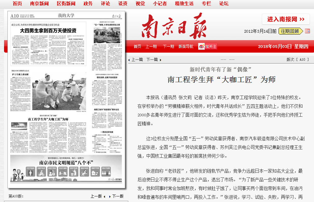 《南京日报》:新时代青年有了新“偶像” 南工程学生拜“大咖工匠”为师